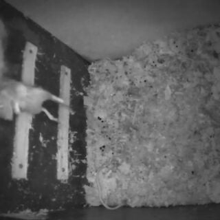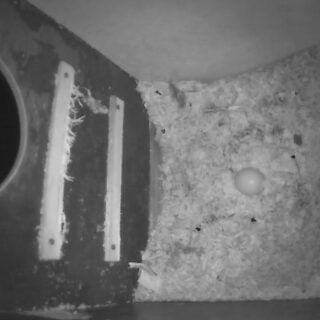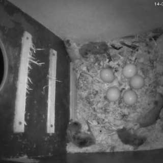 Da uglemor tog en kort aftentur, kunne vi se et æg der bevægede sig og en svag pippen fra ugleungen. Der er også samlet godt med mus ind til de kommende unger.