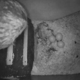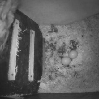 Så blev det 2. æg lagt og hun blev i kassen det meste af natten. Måske pga. nattefrosten eller også fordi det blot var tid til æg nr. 2. Hanuglen var også forbi kassen med en servering i form af en mus.