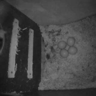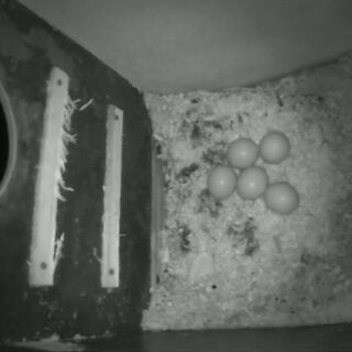 Så fik hun lagt sit 5. æg. Hun må godt snart må stoppe hvis de allesammen bliver til noget. Hanuglen kom forbi med en mus og var noget forvirret over ikke at finde hende i kassen. Hun er stadig ude på små ture i løbet af natten og selv finde føde.