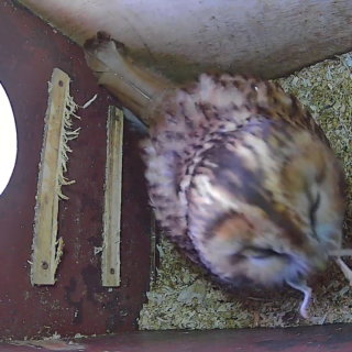 Efter det 4. æg er uglemor nu begyndt at ruge på æggene. Det er efterhånden sjældent at hun forlader uglekassen og hun får også oftere leveret mus af hanuglen.