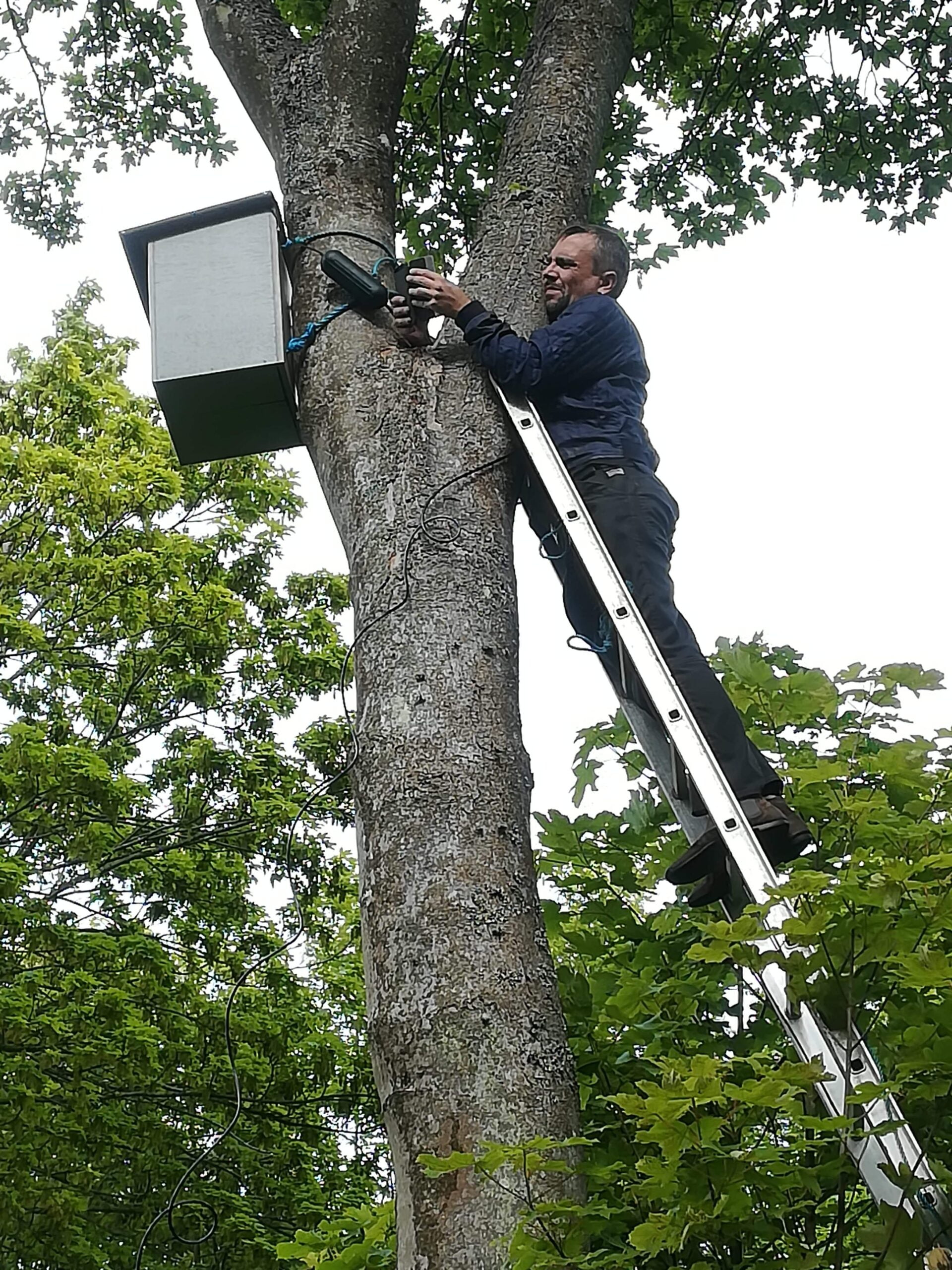HØJT AT FLYVE Optimal placering af uglekasse til natugle: Placering 5-7 meter oppe i et træ I et skovbryn Fri indflyvning til kassen Skygge fra trækrone Gerne med et eller flere grantræer i nærheden af kassen Indflyvnings-hullet mod nord(Derved undgår man, at der bliver for varmt i kassen om sommeren, ligesom man undgår, at der står en stiv vestenvind ind af indflyvnings-hullet.) Det lykkedes at finde en placering til kassen der svarer perfekt til alle de ovenstående forhold.Så nu var der ingen vej tilbage og uglekassen skulle hejses op i sit træ. Første udfordring: En stige der er mere en 4-5...