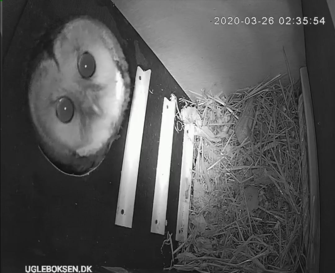 I nattens mulm og mørke kom denne flotte lydløse ugle forbi ugleboksen. Nu krydser vi fingre for at den kunne lide hvad den så og vælger at bosætte sig. Video optaget d. 26-03-2020 kl. 02:35