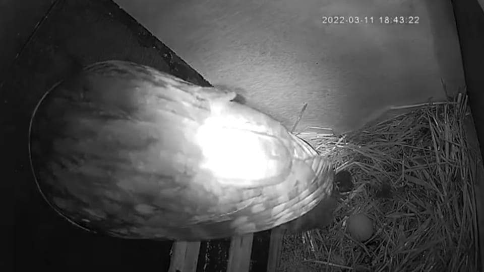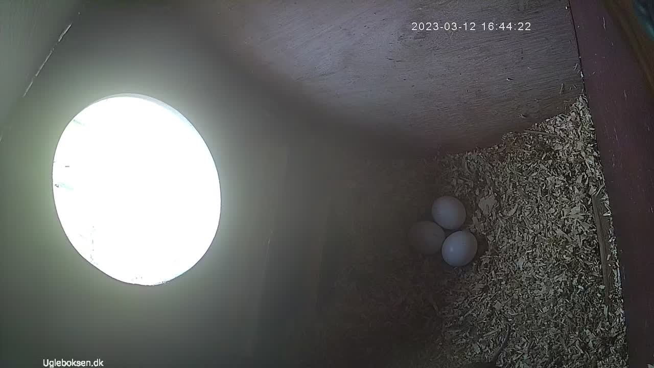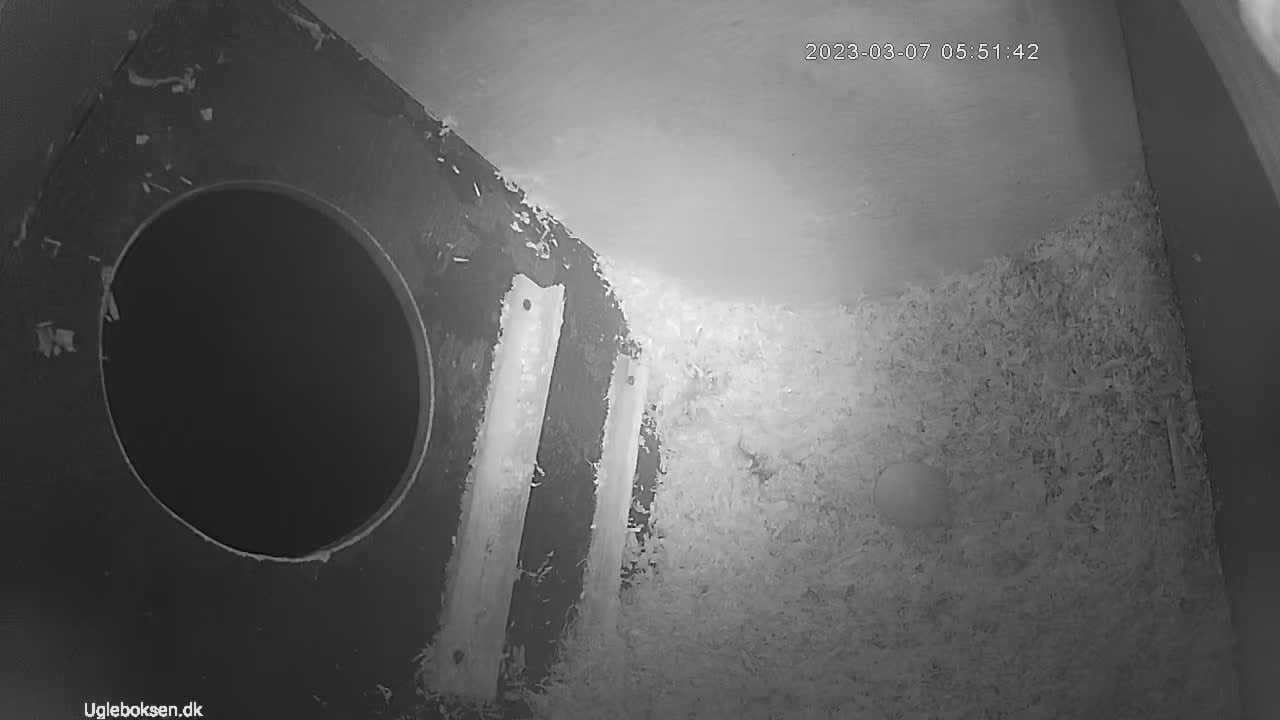 Nu har uglemor lagt årets første æg. Sidste år skete det også i starten af marts (11. marts 2022) Sidste år blev det til i alt 3 æg som blev lagt i løbet af en uges tid. Det første stykke tid vil hun stadig selv flyve ud om natten og finde føde. Først når hun får lagt sig for at ruge på æggene vil hun får maden bragt af hannen.
